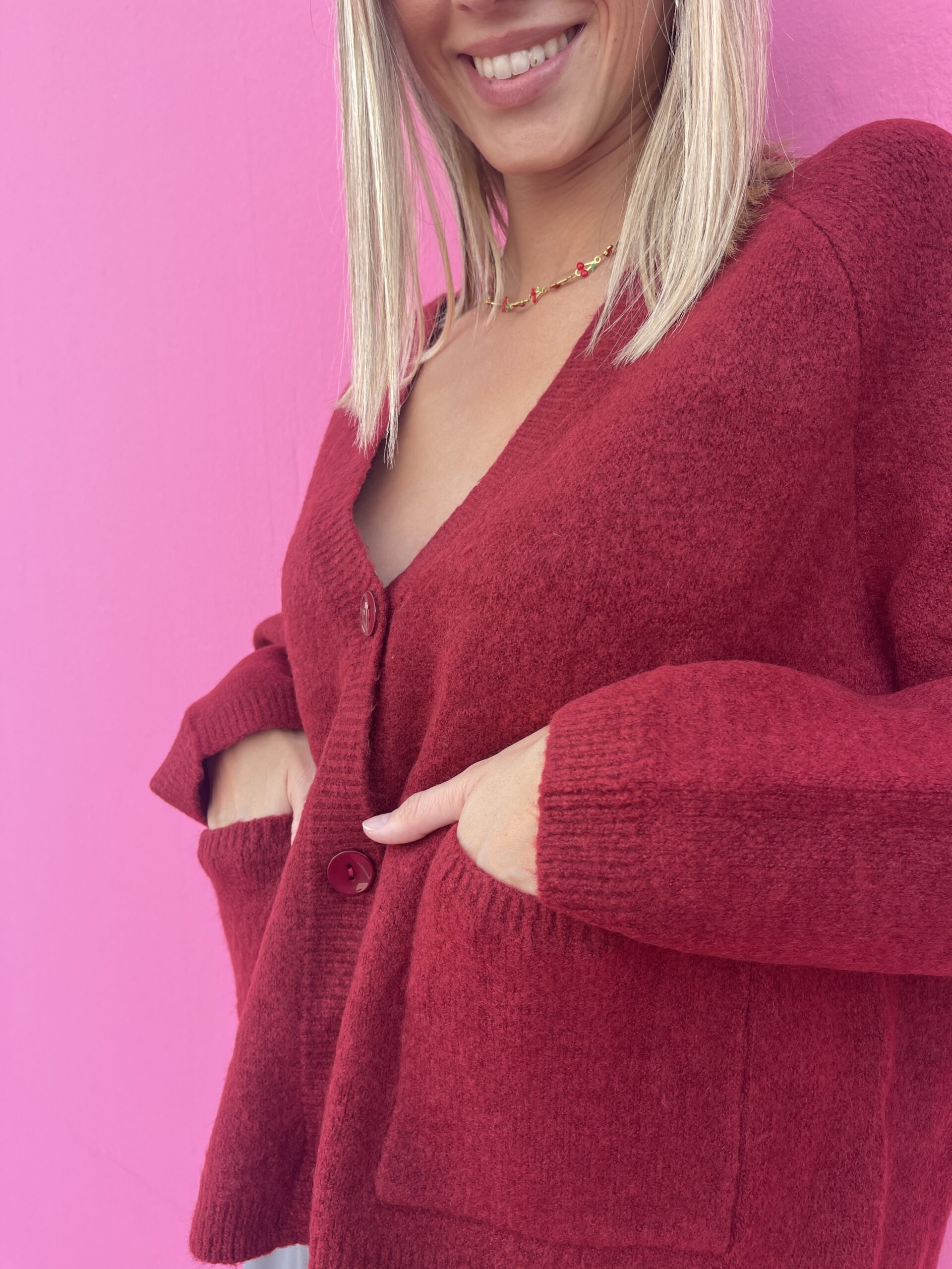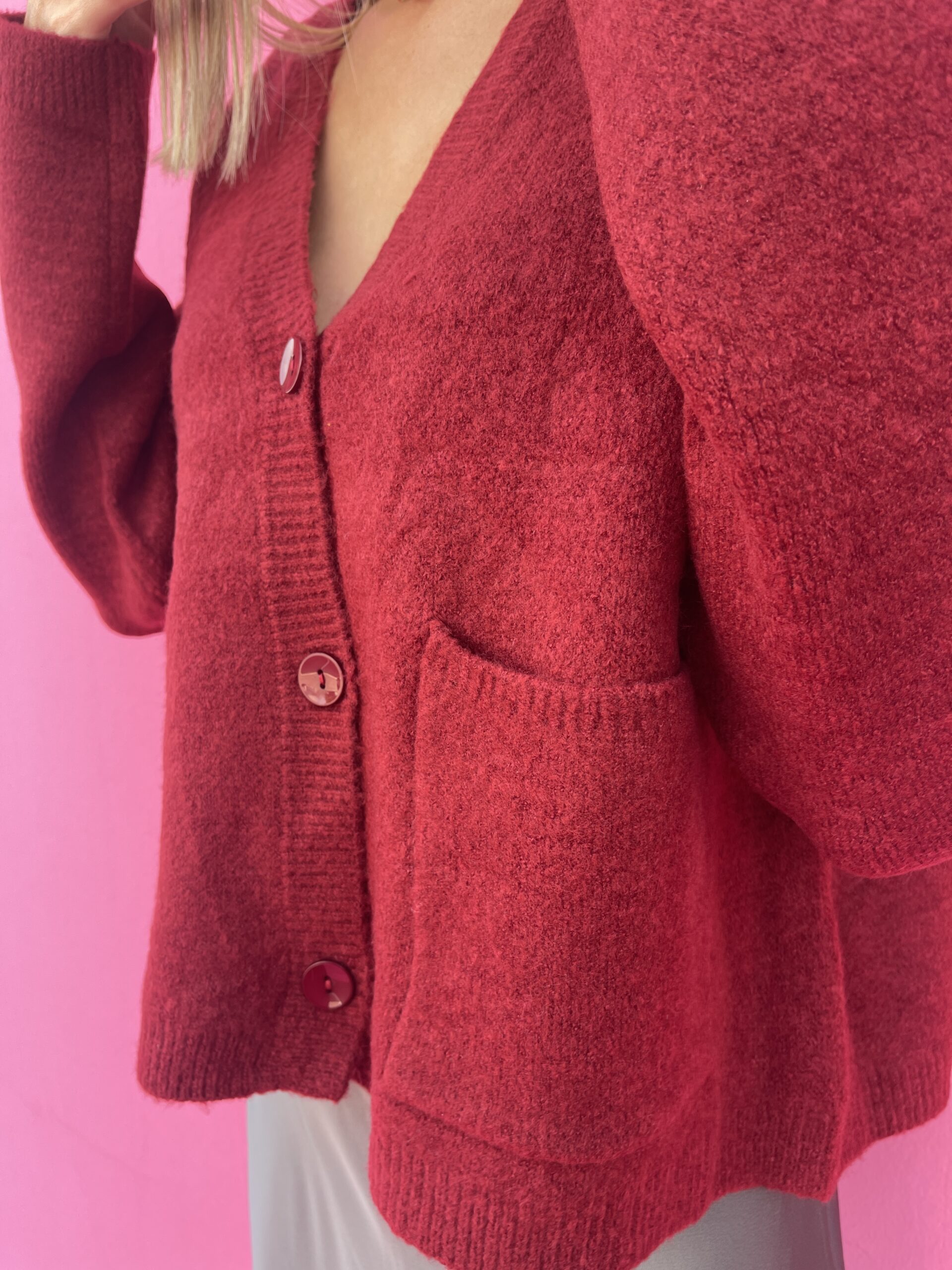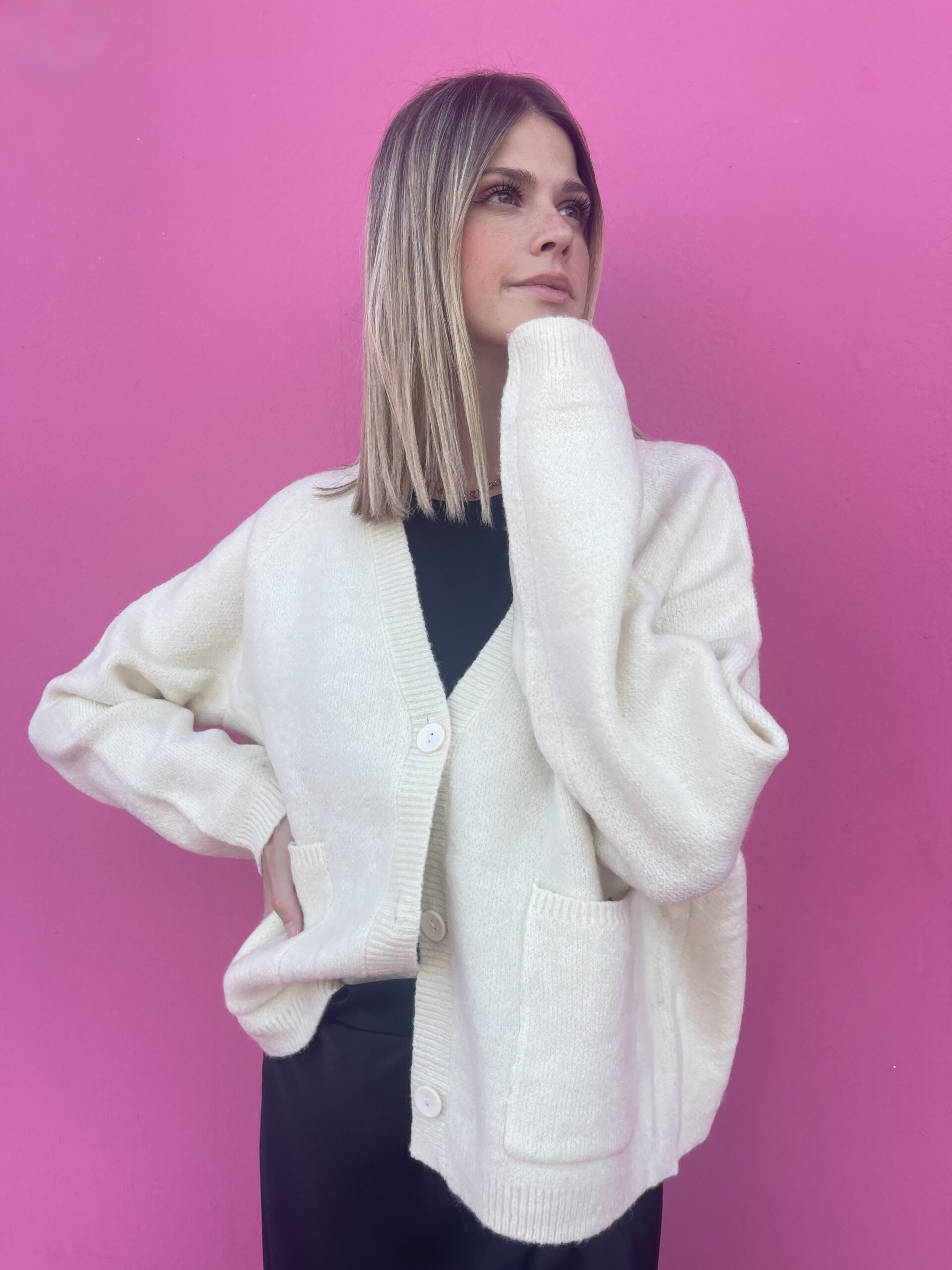 Scopri il nostro Cardigan con scollo a V, un capo perfetto per aggiungere un tocco di eleganza semplice al tuo guardaroba. Con i suoi tre bottoni e le due pratiche tasche frontali, unisce stile e funzionalità, avvolgendo con comfort le giornate più fresche. Ideale da indossare da solo o sopra una camicia o un top, questo cardigan diventa il tuo alleato quotidiano per look raffinati ma naturali.