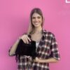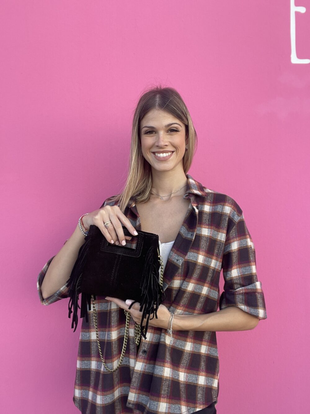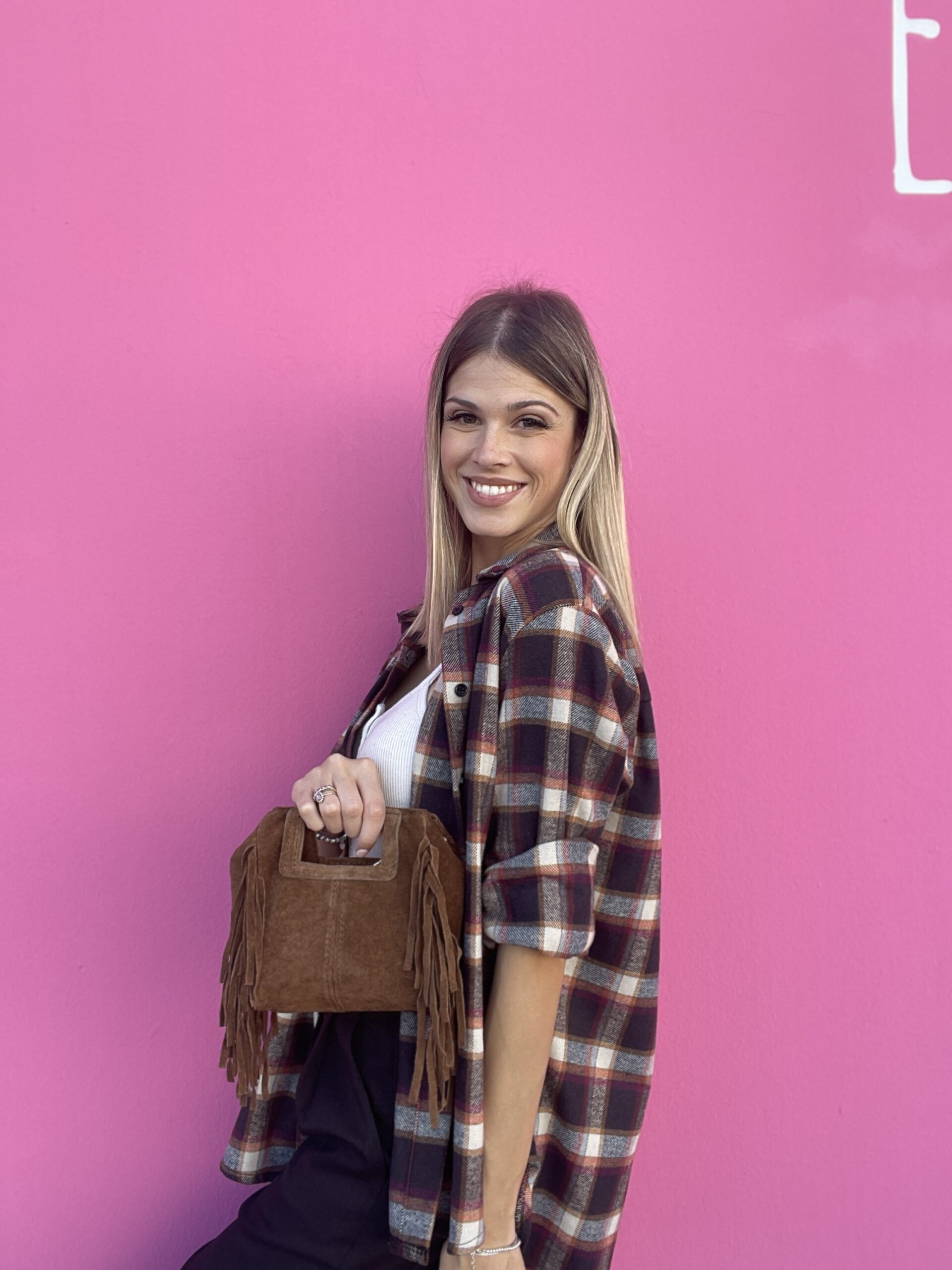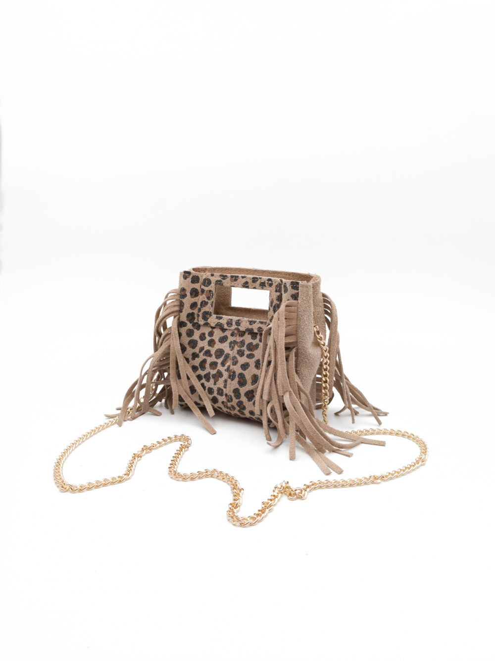 Cecilia: una minibag in vera pelle scamosciata, Made in Italy, compatta ma ricca di carattere. Le frange laterali donano movimento e personalità, mentre i manici integrati nel corpo della borsa esaltano la sua linea pulita. Può essere portata a mano o a spalla grazie alla tracolla a catena in finitura gold. Interno foderato con chiusura a calamita.