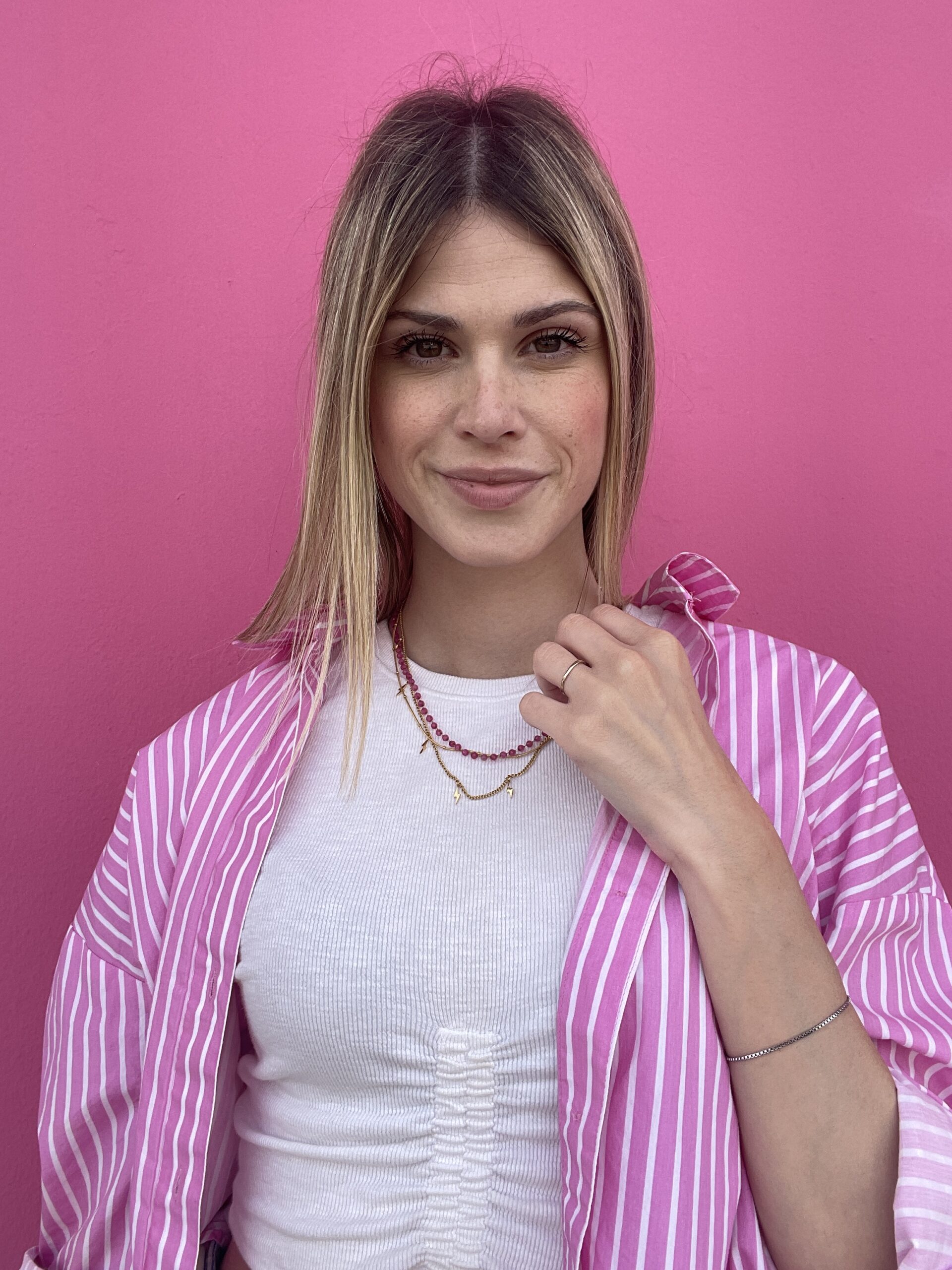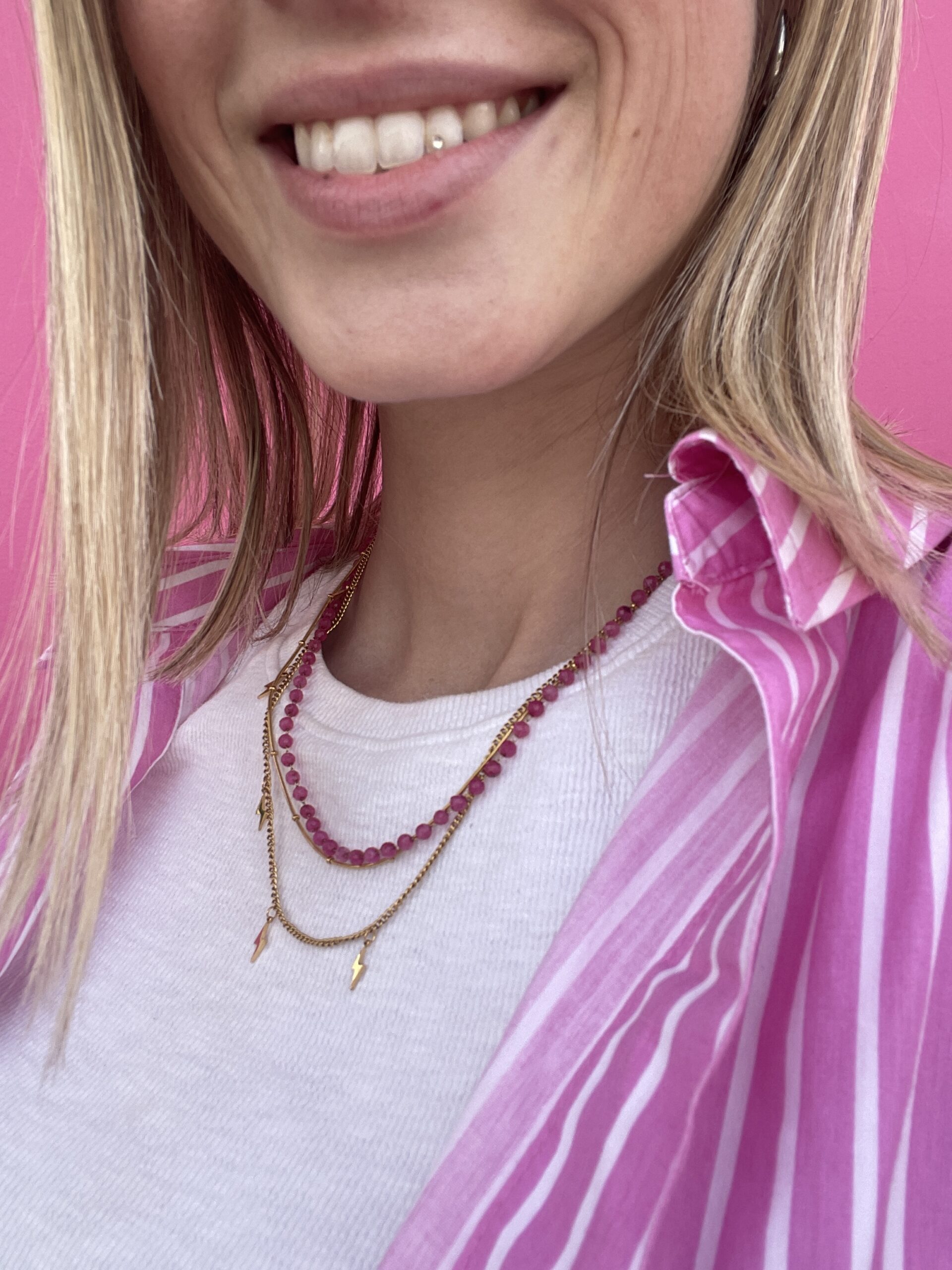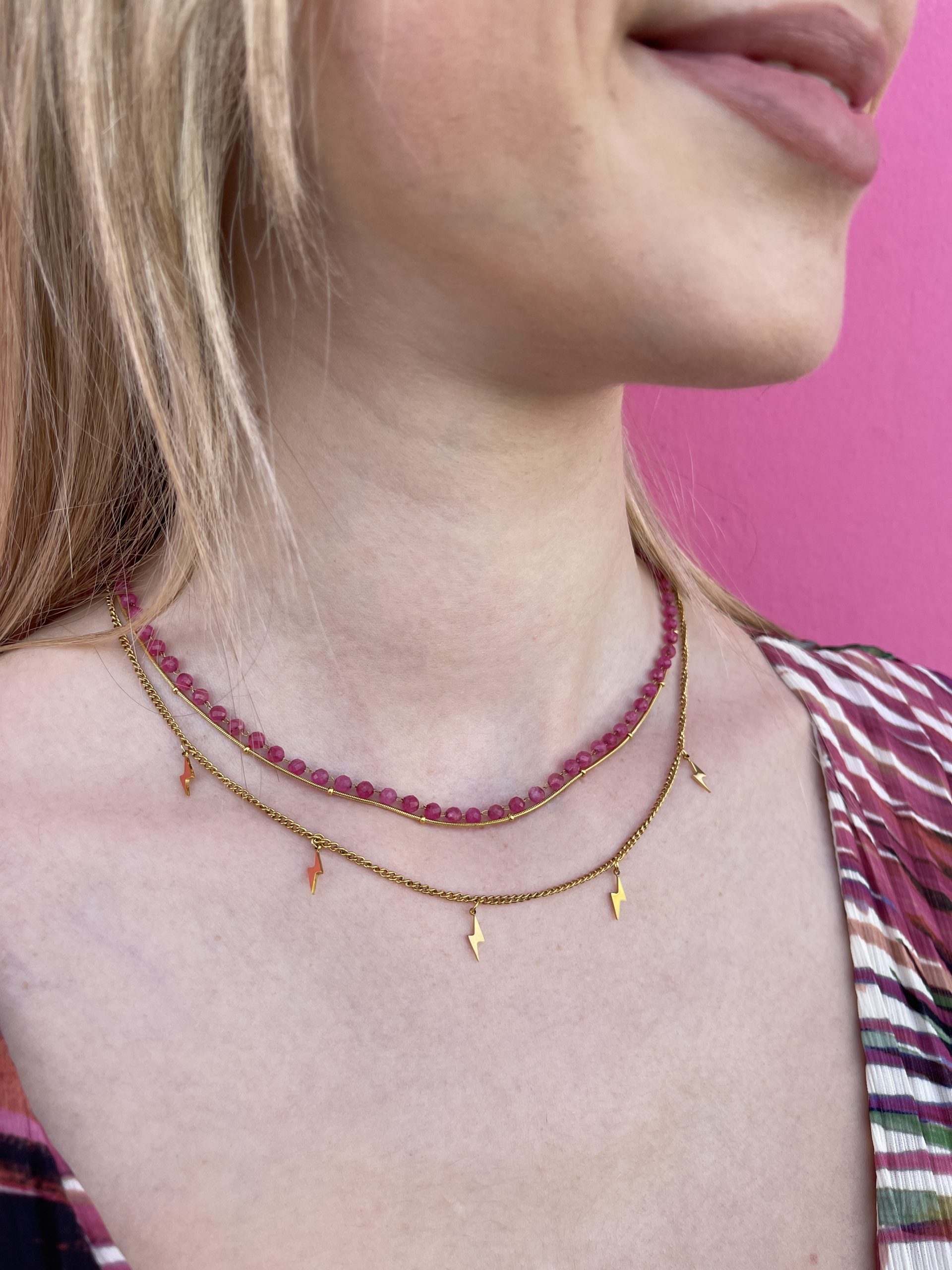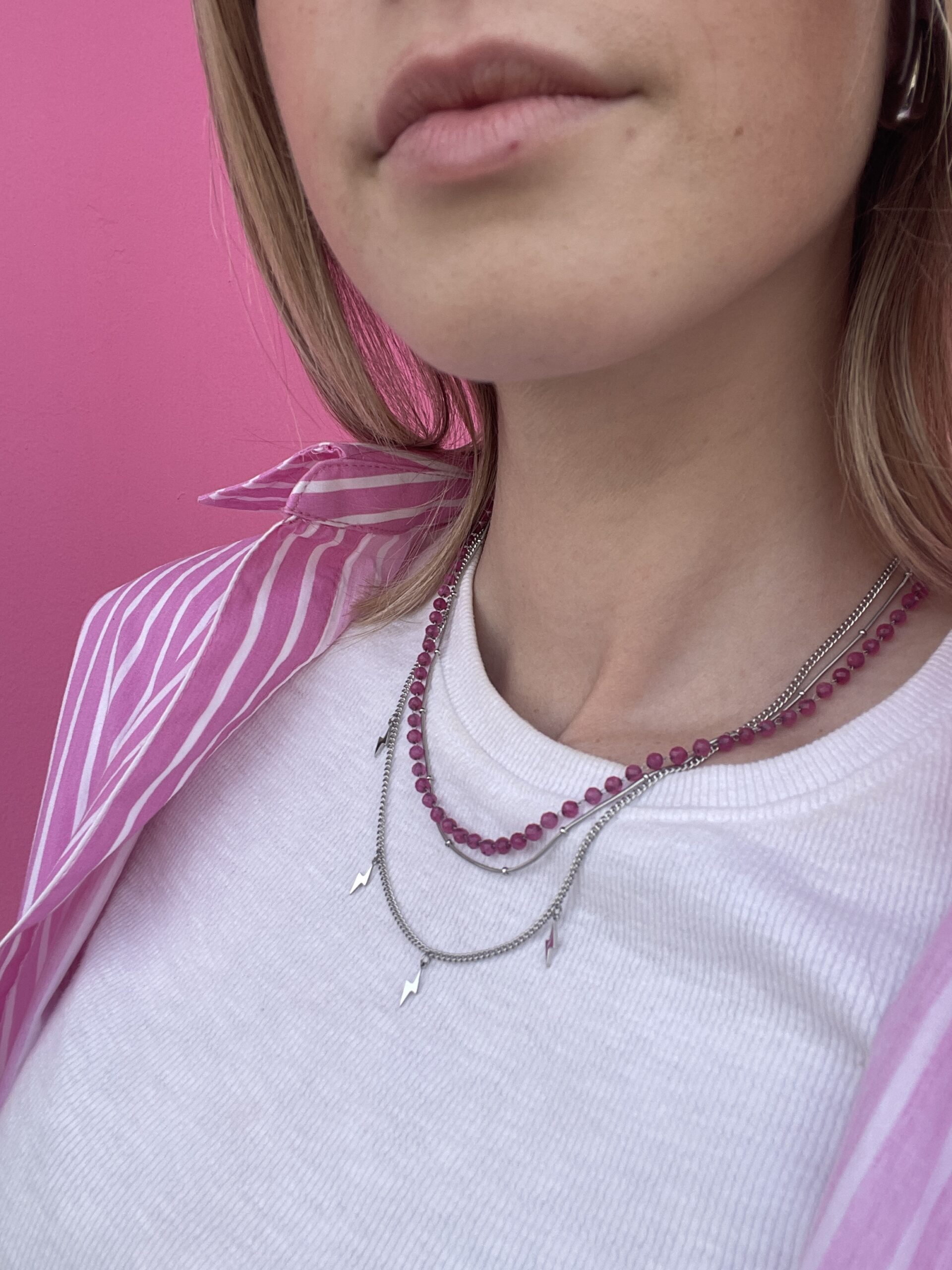 Perfetta con un top semplice, una camicia aperta o un abito leggero. Funziona da sola o in layering con altre collane per un effetto più costruito. Il fulmine? Un tocco inaspettato che rende tutto meno noioso.