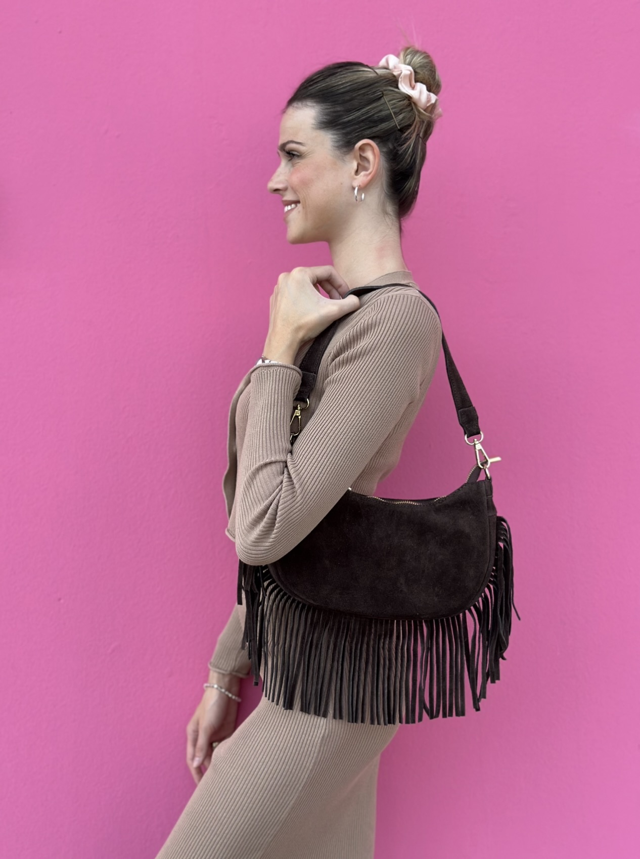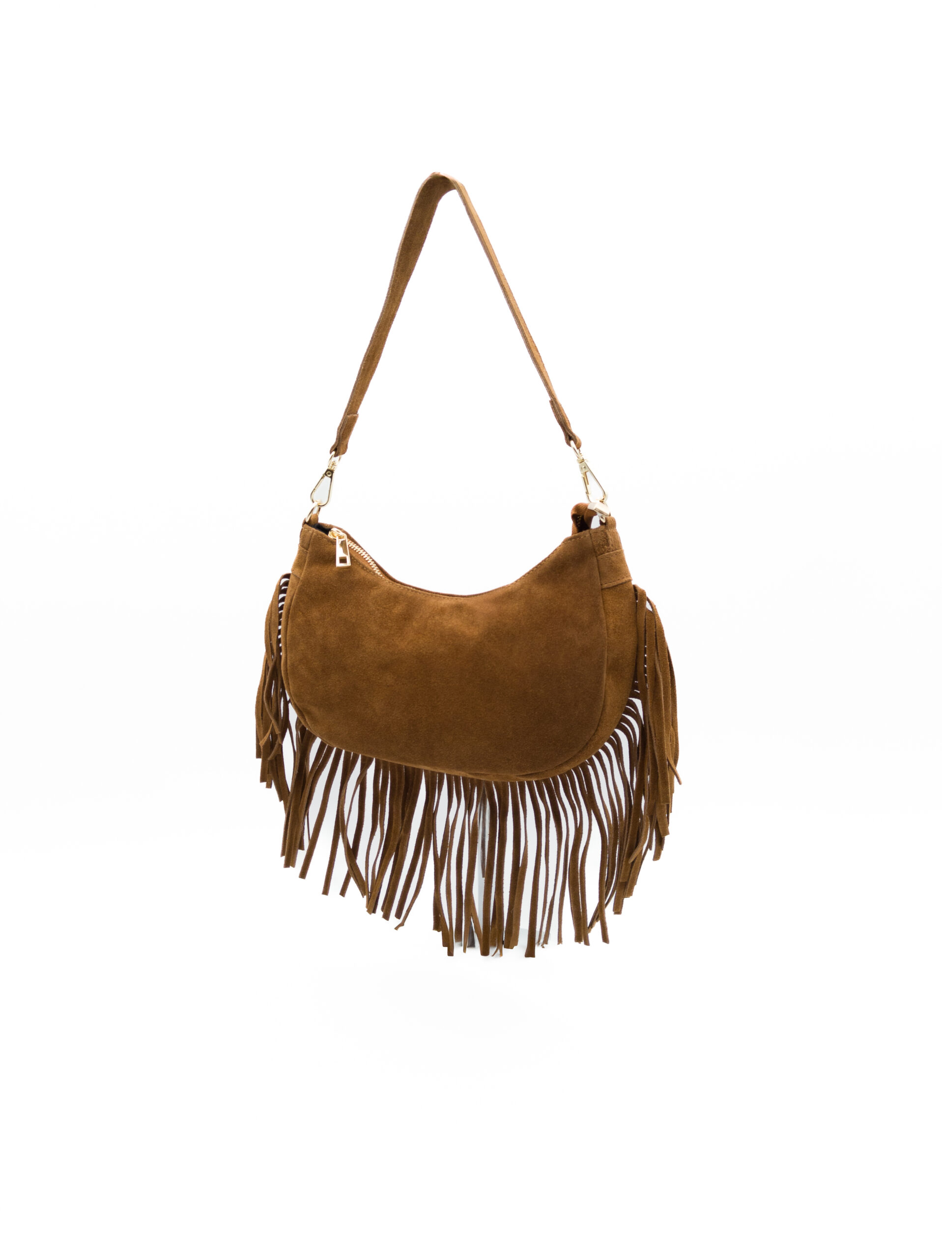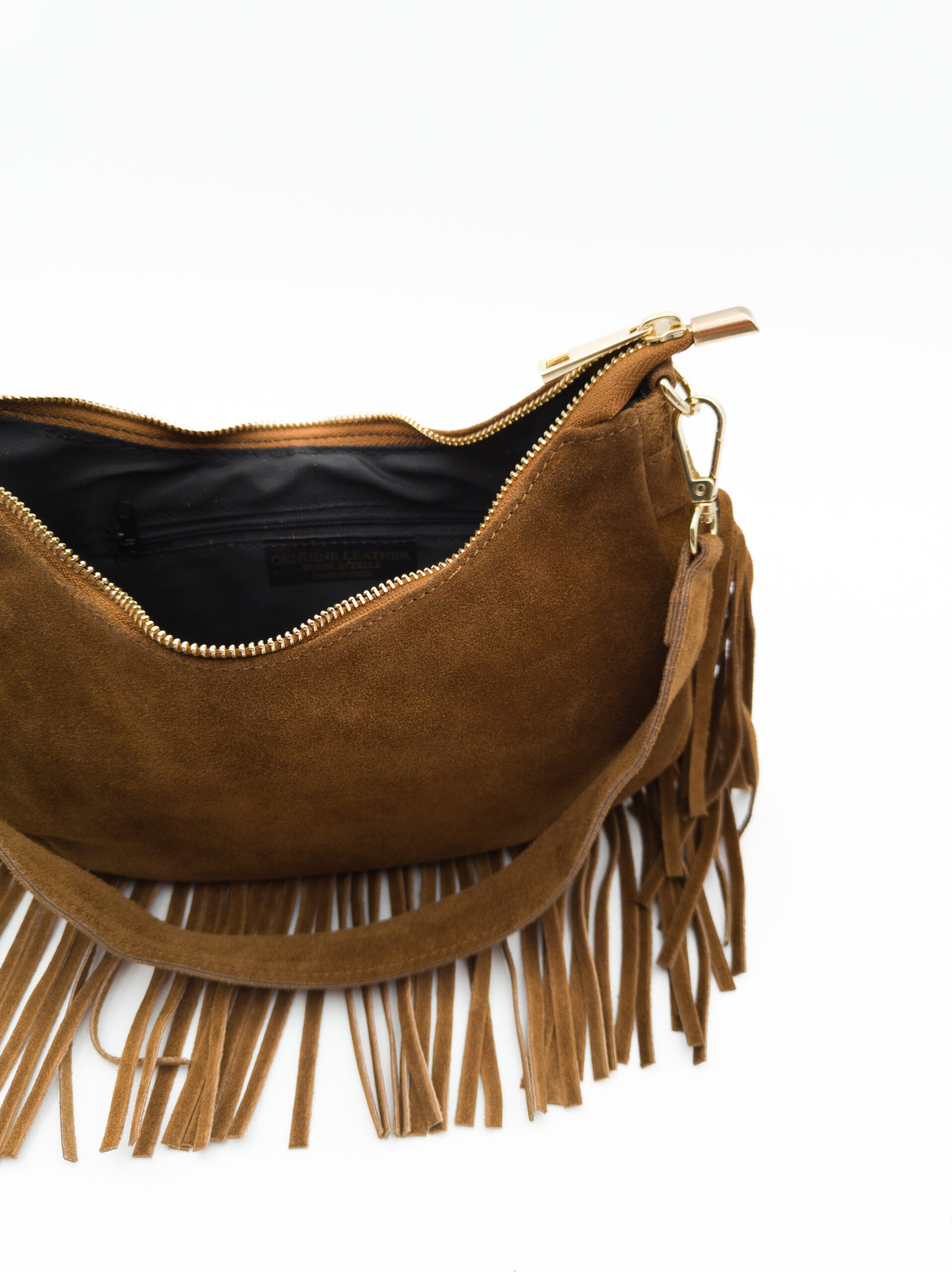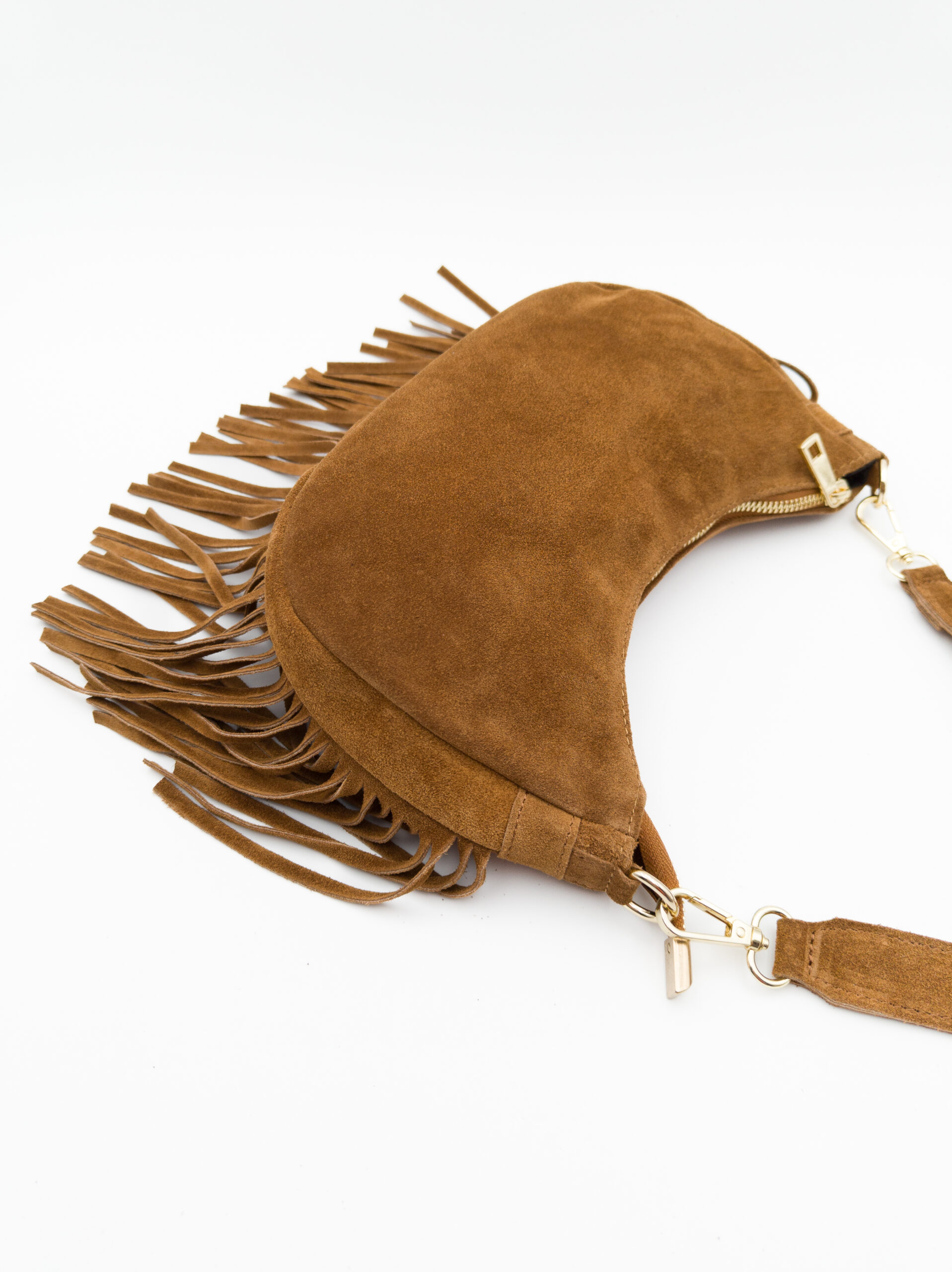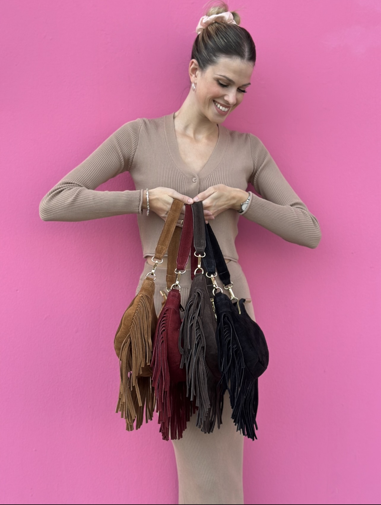 La Dallas è la borsa che parla di libertà, movimento e personalità. Realizzata in vera pelle scamosciata, conquista con la sua forma a mezzaluna morbida e il dettaglio iconico delle frange lunghe, che ondeggiano a ogni passo.