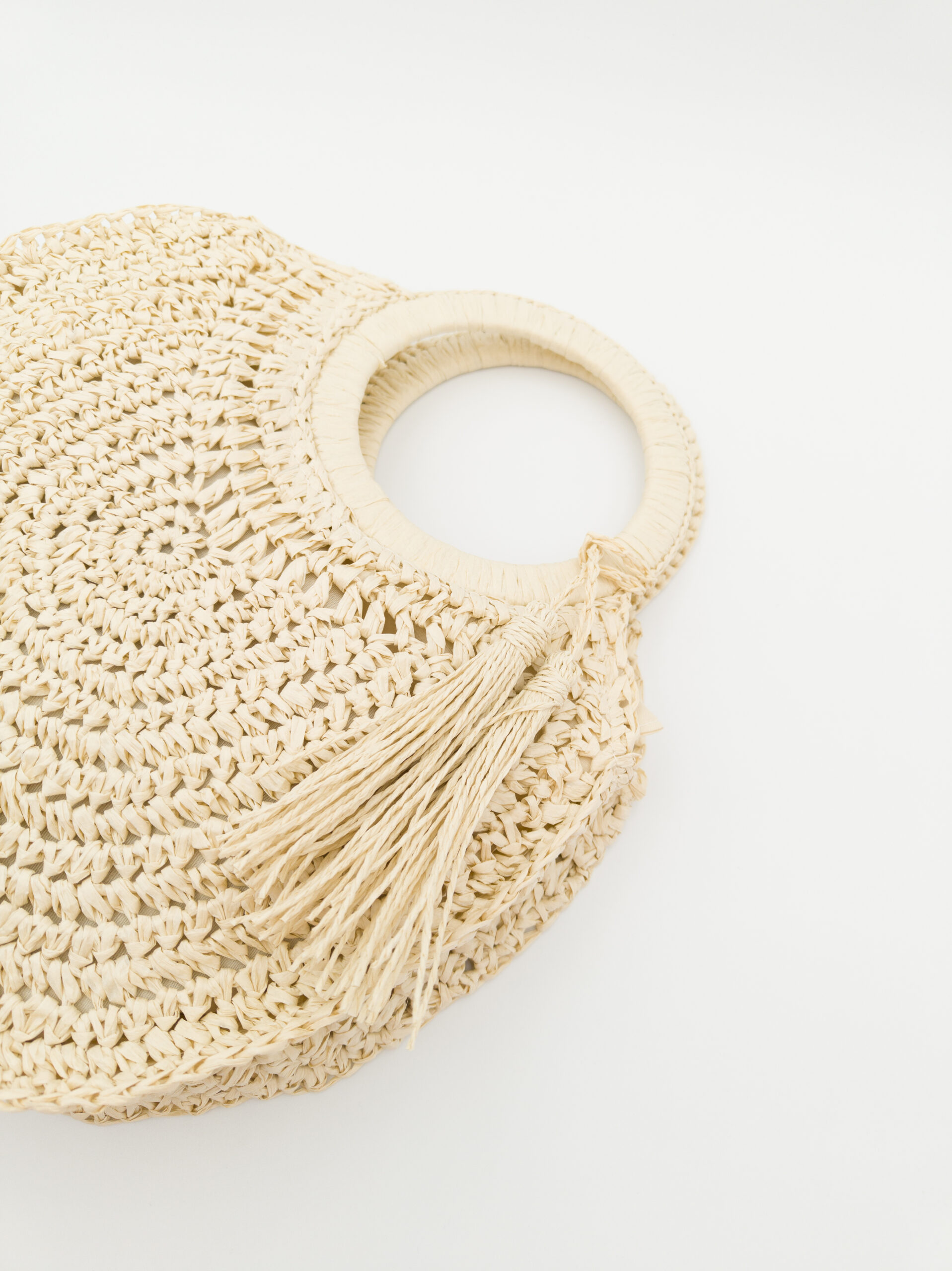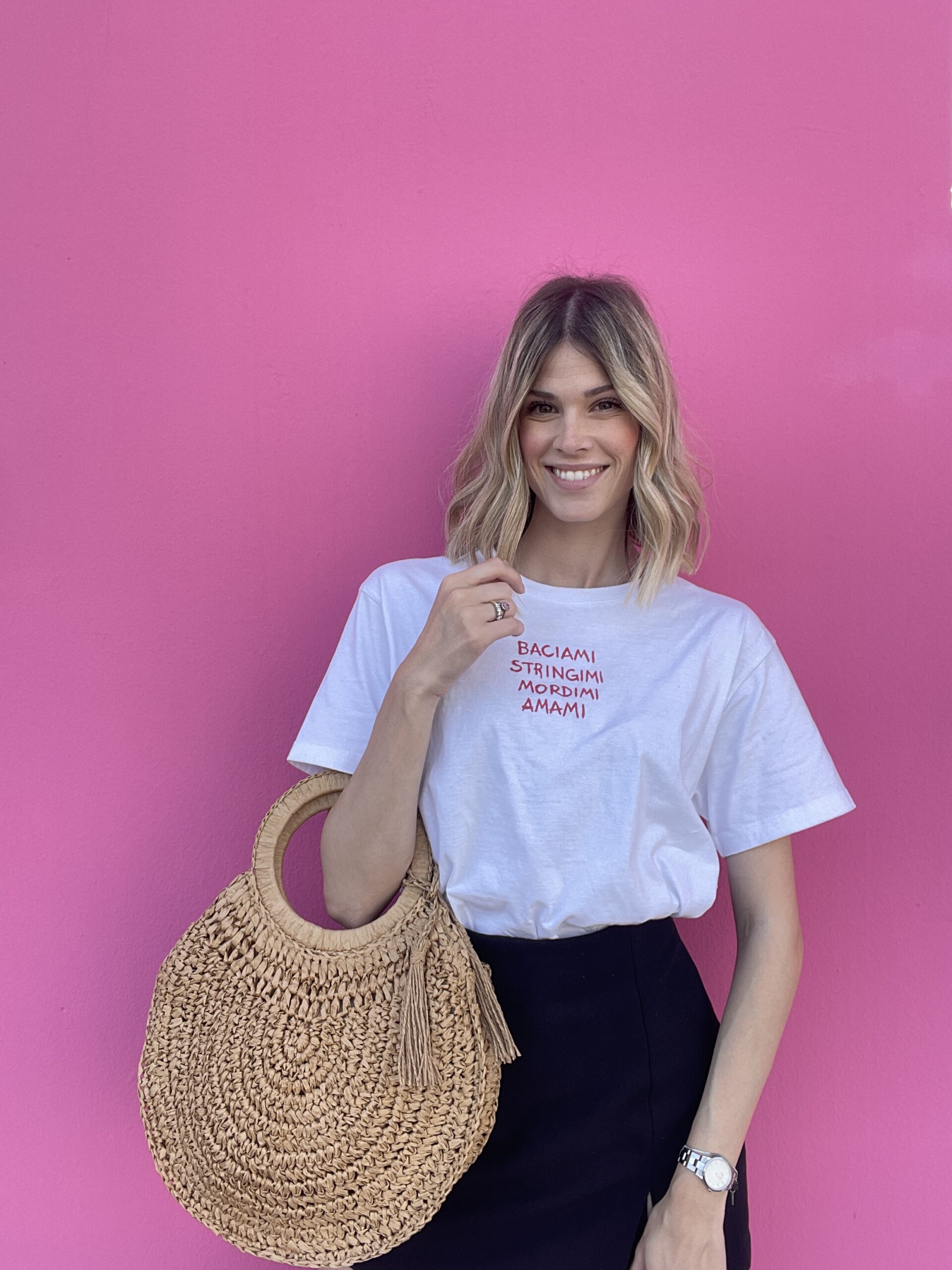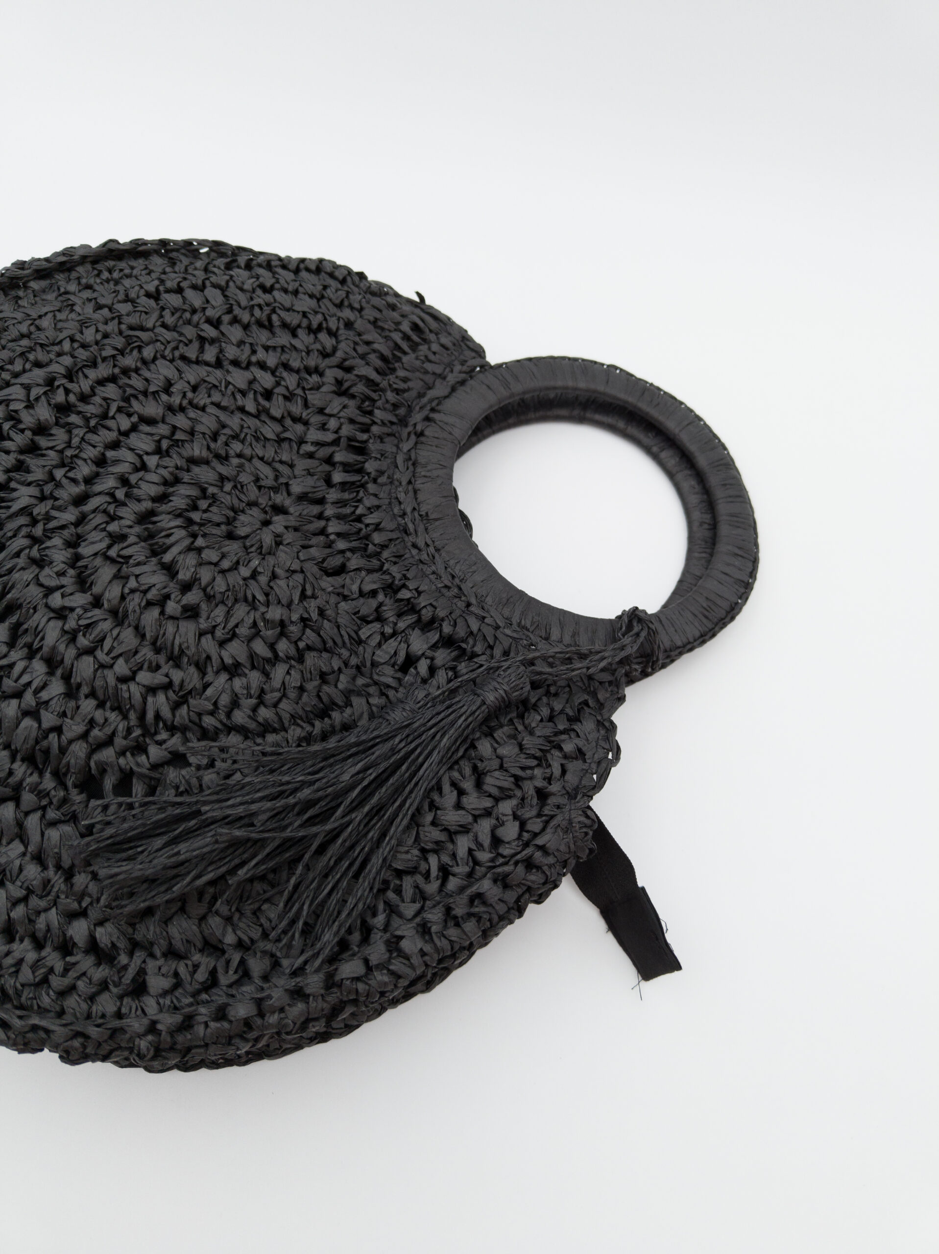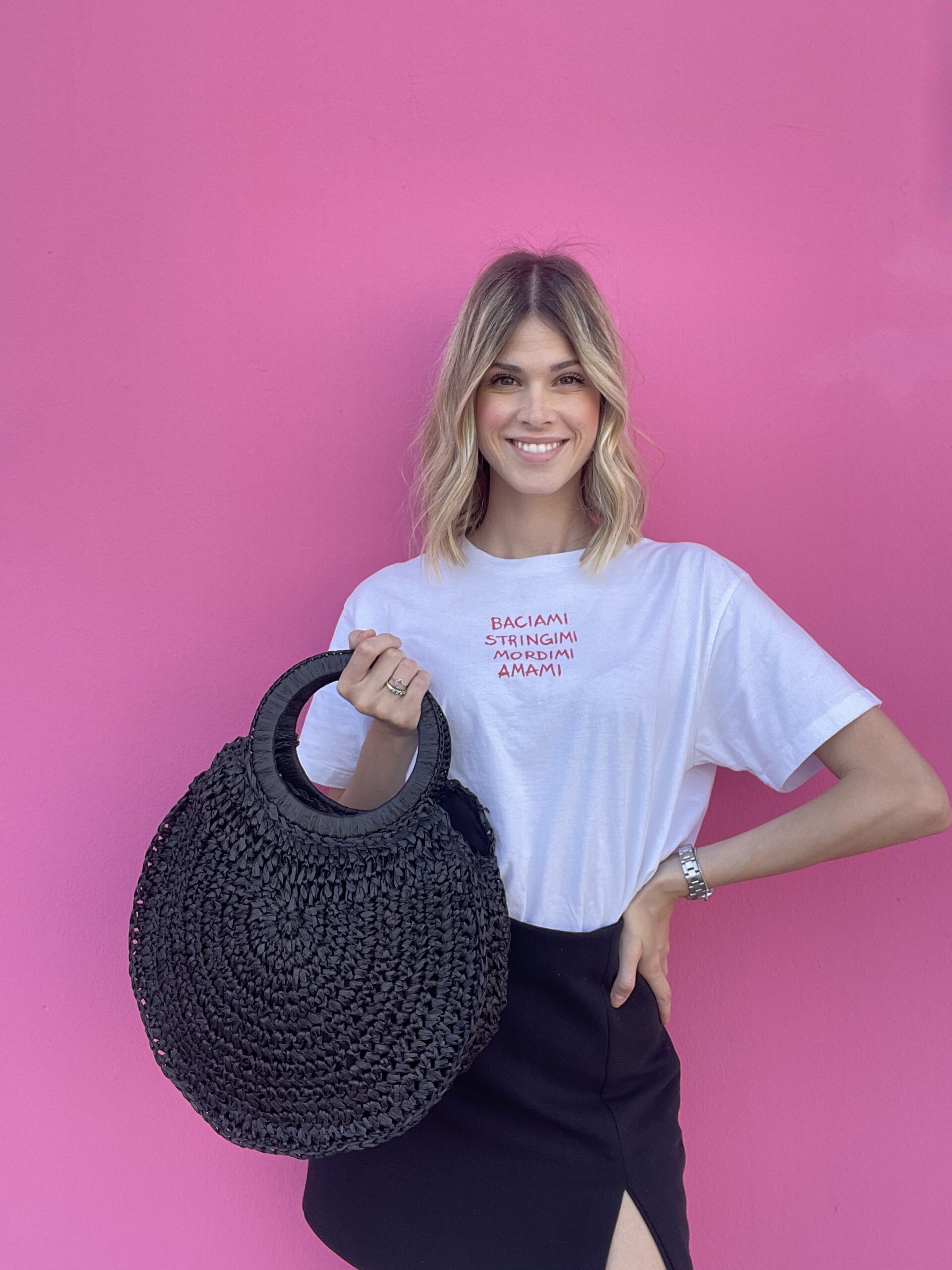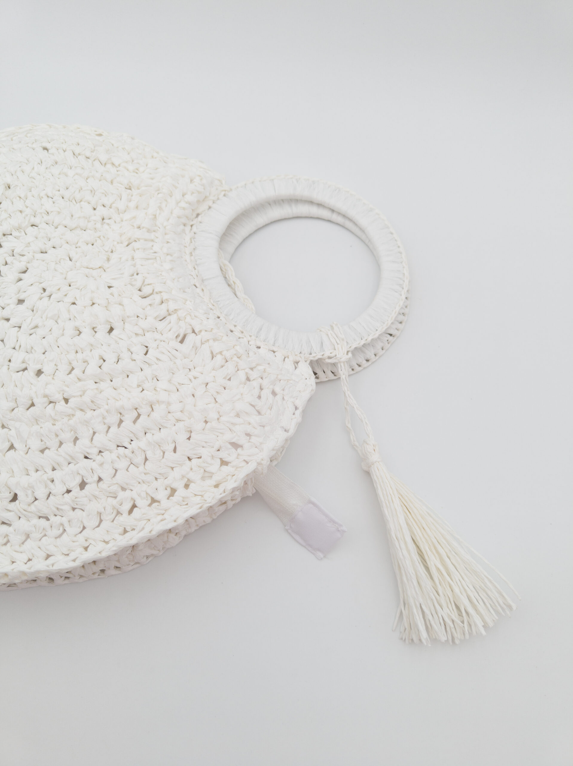 Può essere portata anche a mano grazie al manico rigido rotondo, e presenta un pendente decorativo abbinato, removibile, che aggiunge un tocco distintivo alla sua forma essenziale.