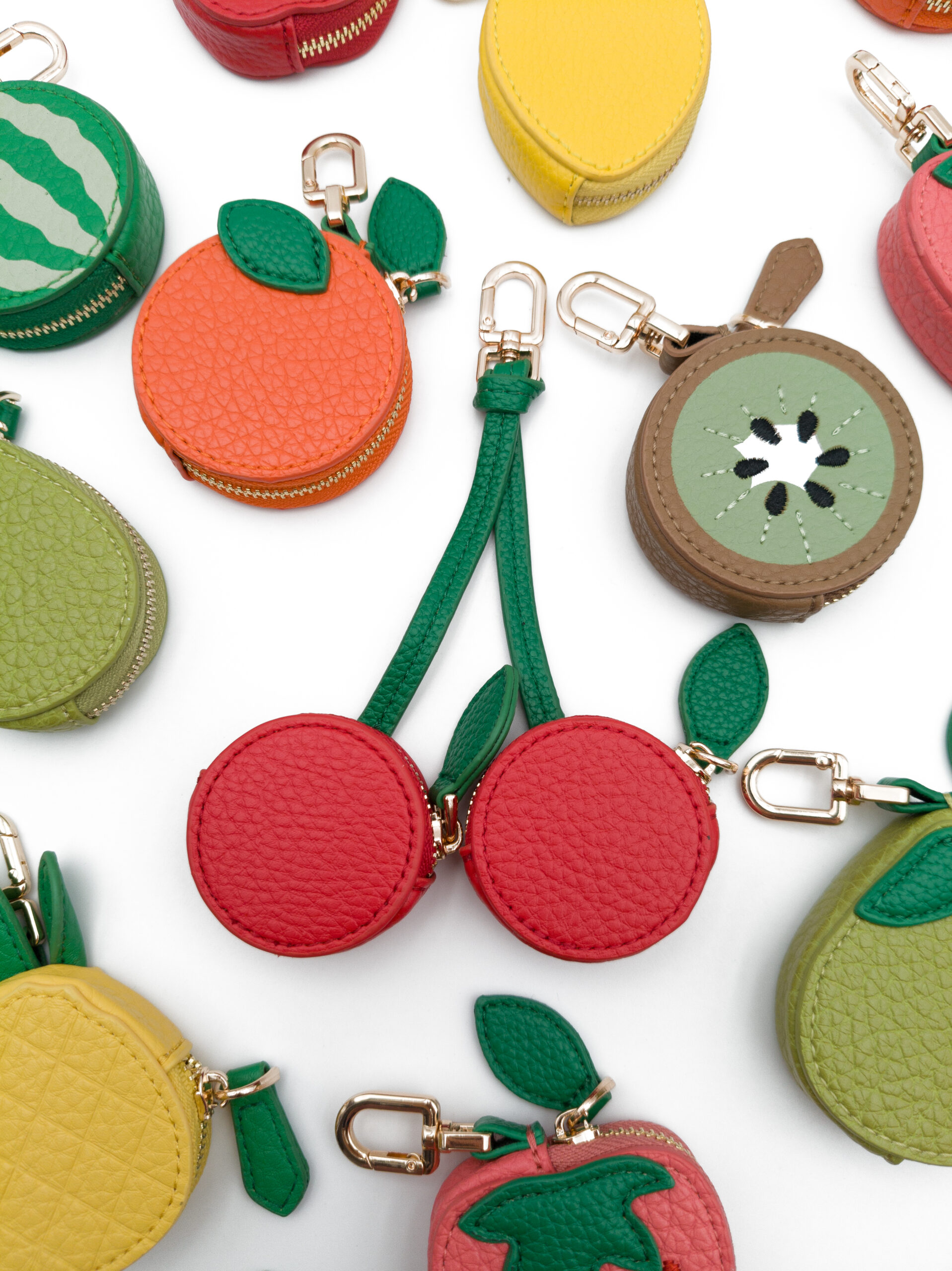 Non solo un accessorio decorativo, ma anche un piccolo contenitore funzionale: grazie alla zip, Fruttino può custodire chiavi, monete, AirPods o piccoli oggetti da tenere sempre a portata di mano. Il gancetto con hardware gold permette di attaccarlo facilmente alla borsa, allo zaino o di usarlo come portachiavi.