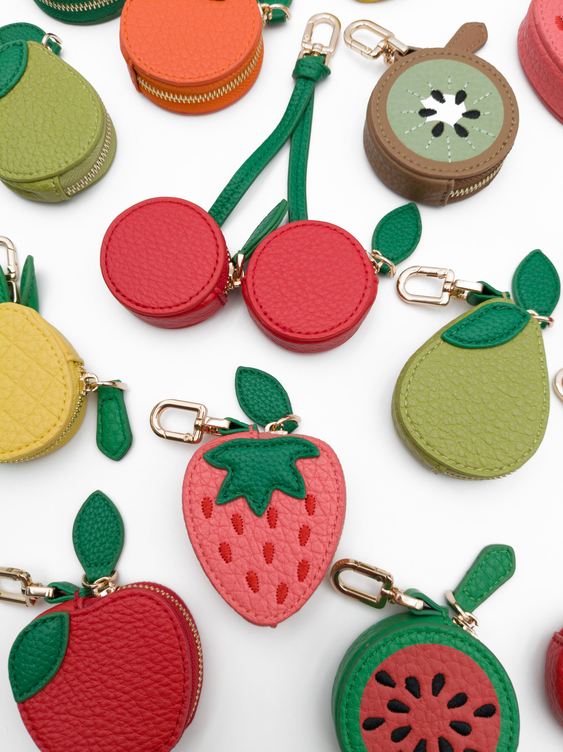 Non solo un accessorio decorativo, ma anche un piccolo contenitore funzionale: grazie alla zip, Fruttino può custodire chiavi, monete, AirPods o piccoli oggetti da tenere sempre a portata di mano. Il gancetto con hardware gold permette di attaccarlo facilmente alla borsa, allo zaino o di usarlo come portachiavi.