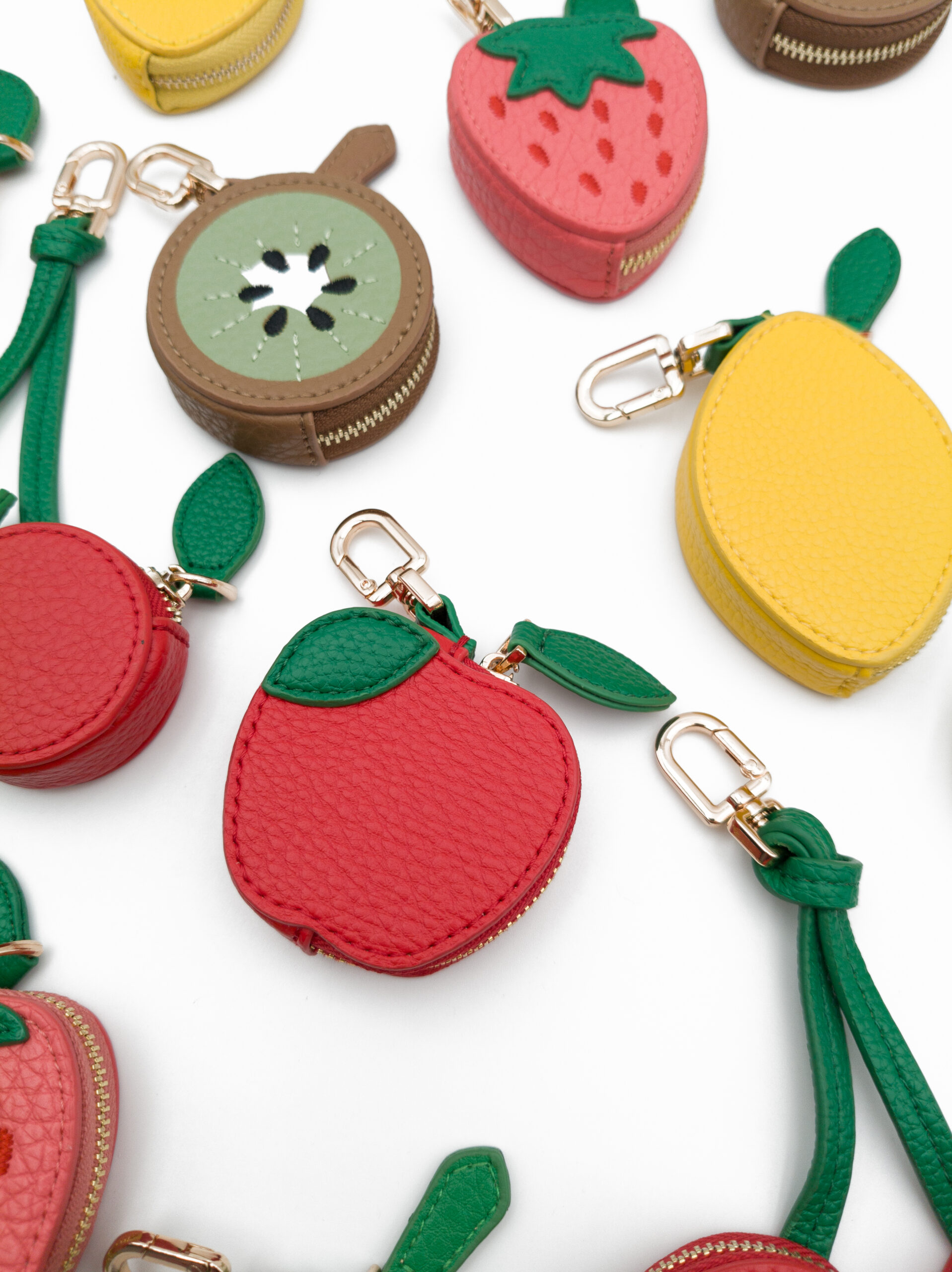 Non solo un accessorio decorativo, ma anche un piccolo contenitore funzionale: grazie alla zip, Fruttino può custodire chiavi, monete, AirPods o piccoli oggetti da tenere sempre a portata di mano. Il gancetto con hardware gold permette di attaccarlo facilmente alla borsa, allo zaino o di usarlo come portachiavi.