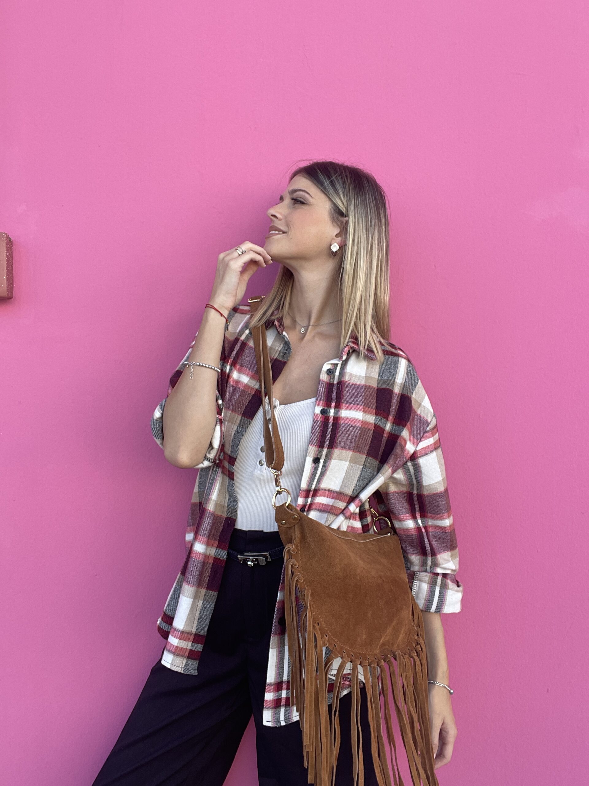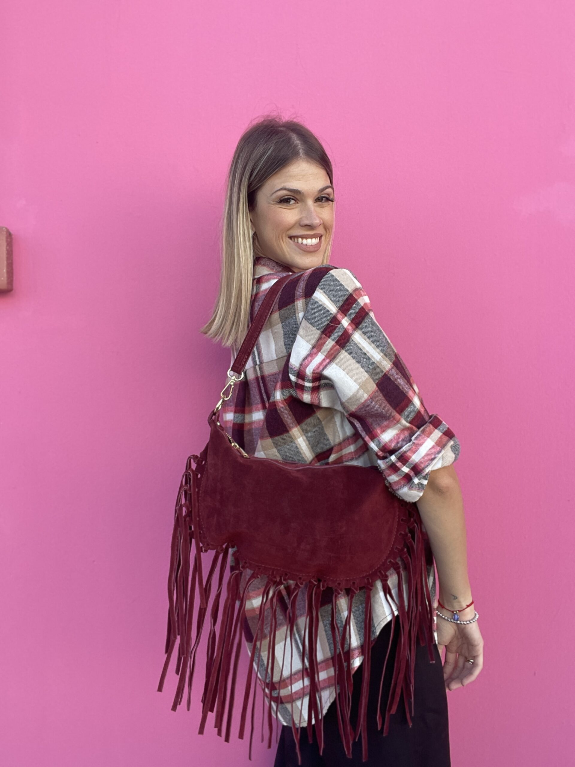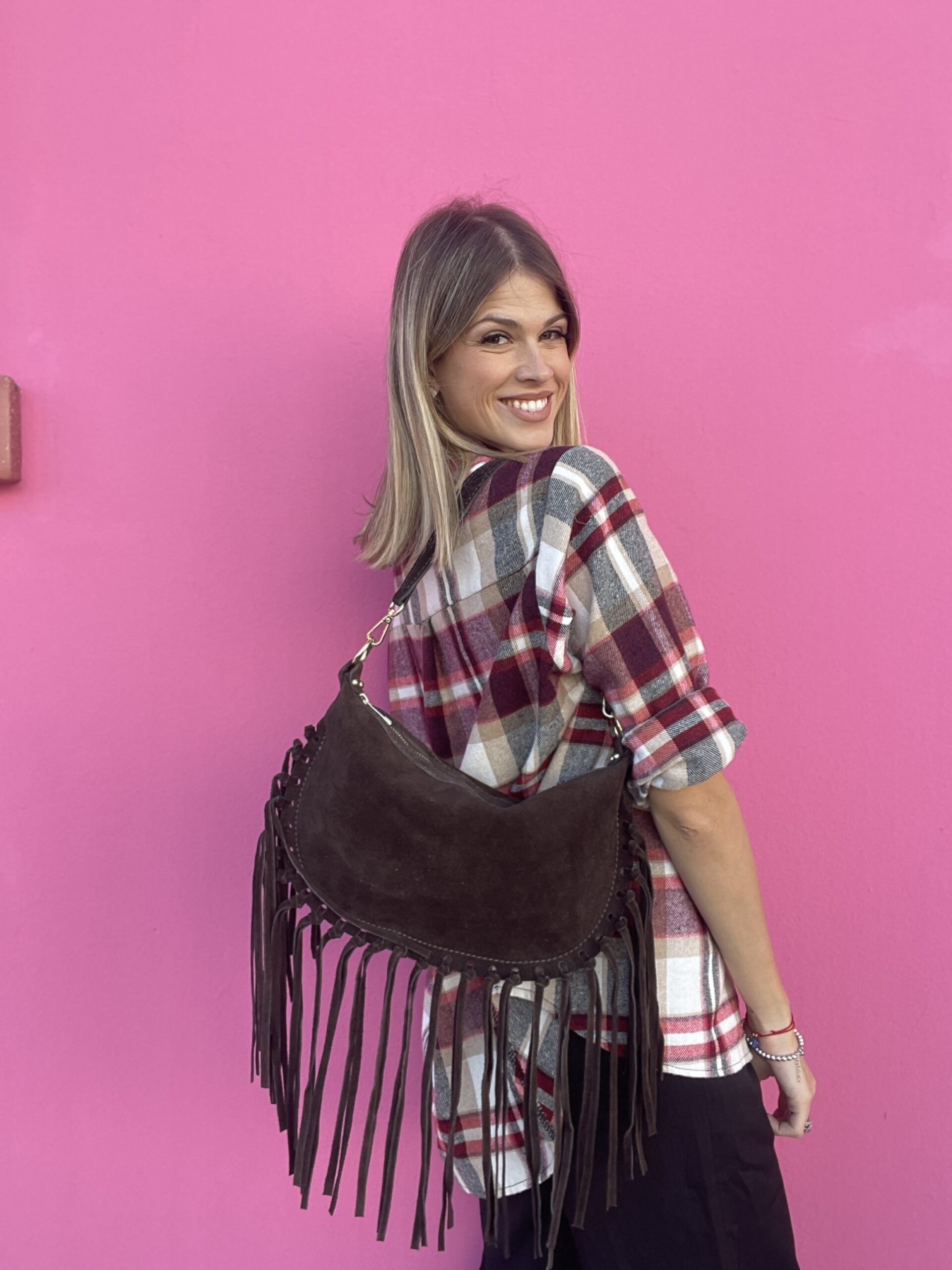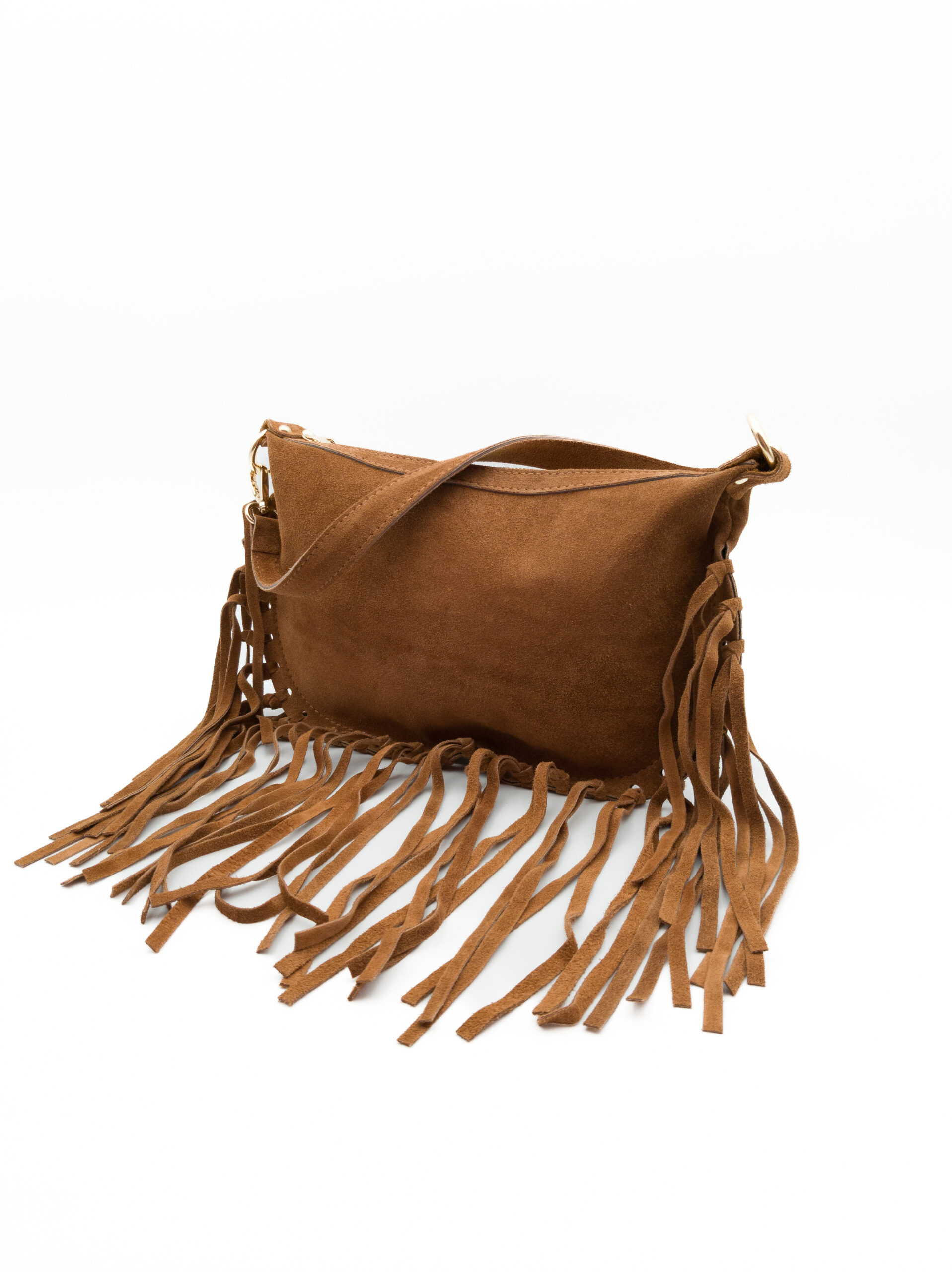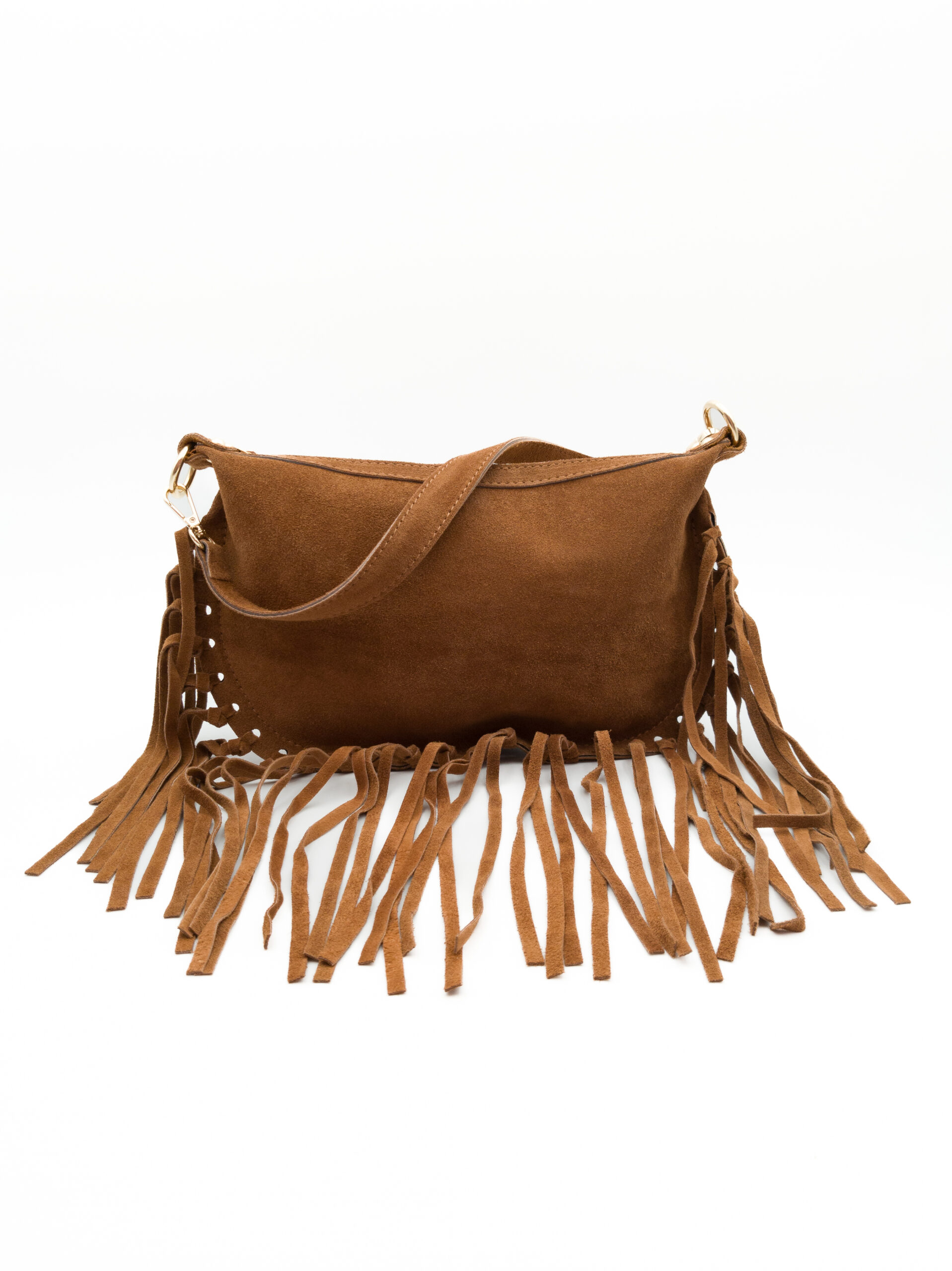 Nevada: borsa in vera pelle scamosciata, Made in Italy, con forme morbide e arrotondate alla base. Le frange decorative donano movimento e carattere, mentre l’hardware in finitura gold aggiunge un tocco elegante. Dotata di chiusura principale con zip e interno foderato con tasca interna con zip, è pratica e versatile. Completa di doppia tracolla per portabilità personalizzata.